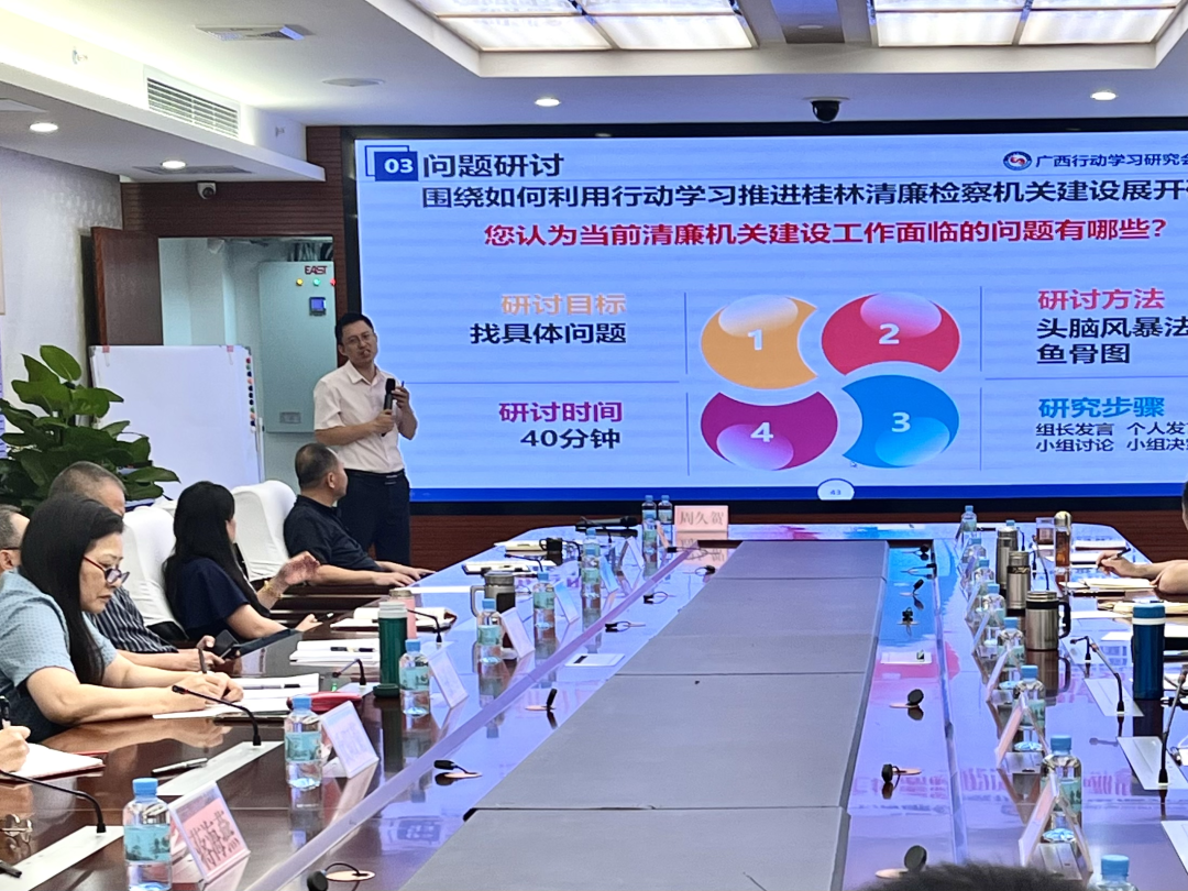 近日,桂林市现金365_365bet有手机版吗_和365差不多的平台有哪些组织召开学习贯彻党的十九届六中全会精神暨自治区第十二次党代会精神研讨会,研讨会以行动学习的方式进行,主题为“推进清廉检察机关建设”。中共桂林市委党校经济学教研室主任、副教授周久贺受邀作为本次研讨会的行动学习促进师。市检察院处、团级领导干部参加研讨会。