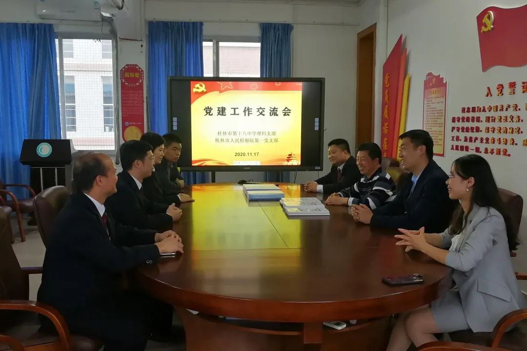 当日,桂林市检察院第一党支部党员代表与桂林市第十八中学理科支部党员代表召开会议,就法治校园建设以及党建工作的开展进行了深度的交流。