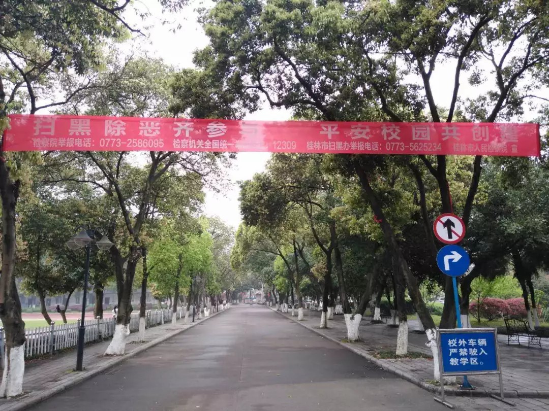桂林市第十八中学悬挂了标注有桂林市扫黑除恶举报热线及检察机关全国统一举报热线的宣传横幅。