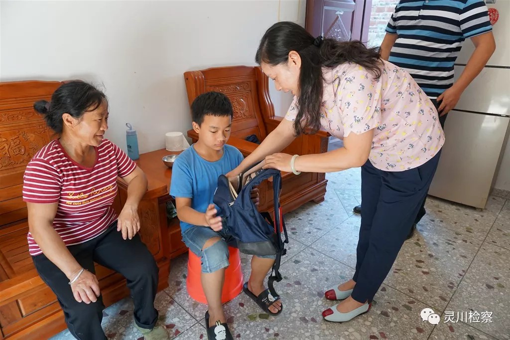 近日,灵川县检察院曾秀维检察长在秋季开学前夕深入灵川县定江镇,为这里联系点贫困群众家中的学龄儿童送上开学礼物。